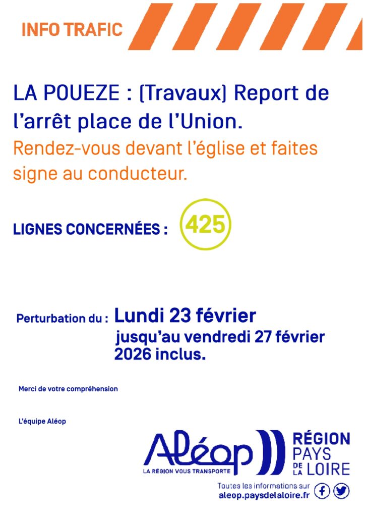 En raison de travaux de mise aux normes de l’arrêt de car de La Pouëze, l’arrêt habituel place de l’Union sera reporté du lundi 23 au vendredi 27 février 2026 inclus.