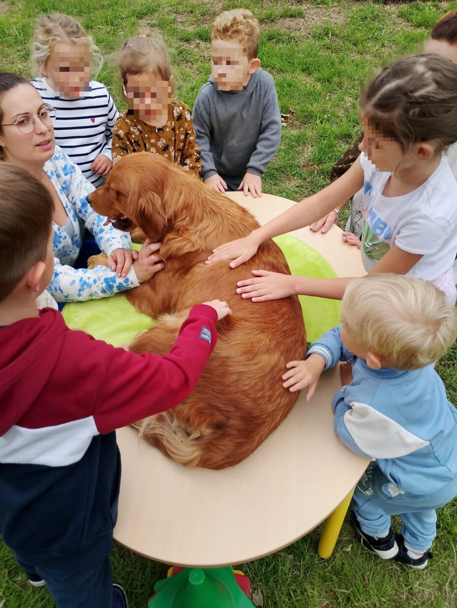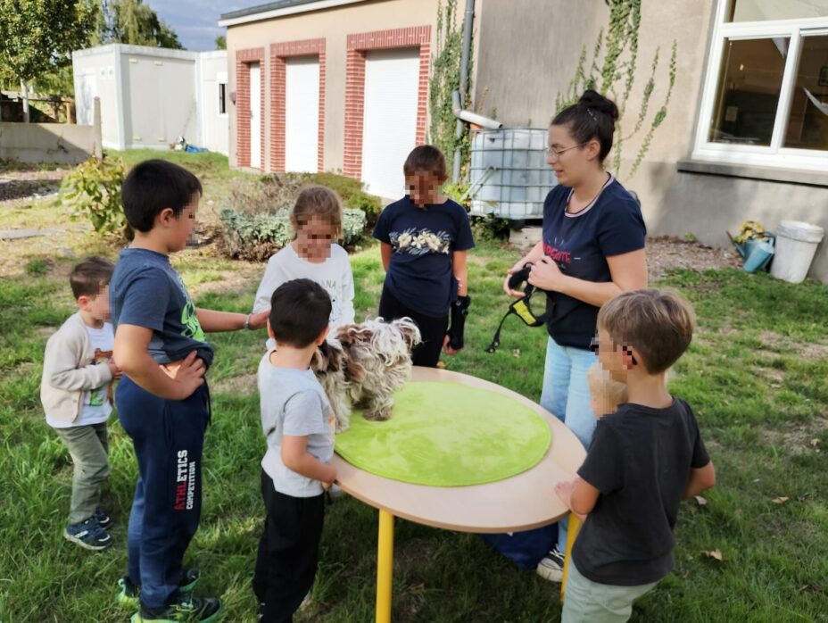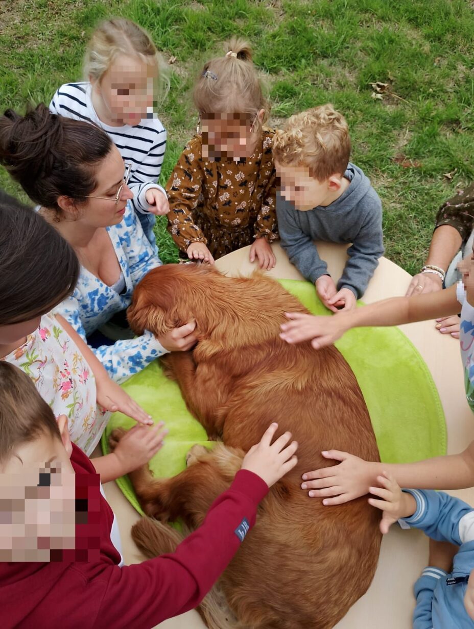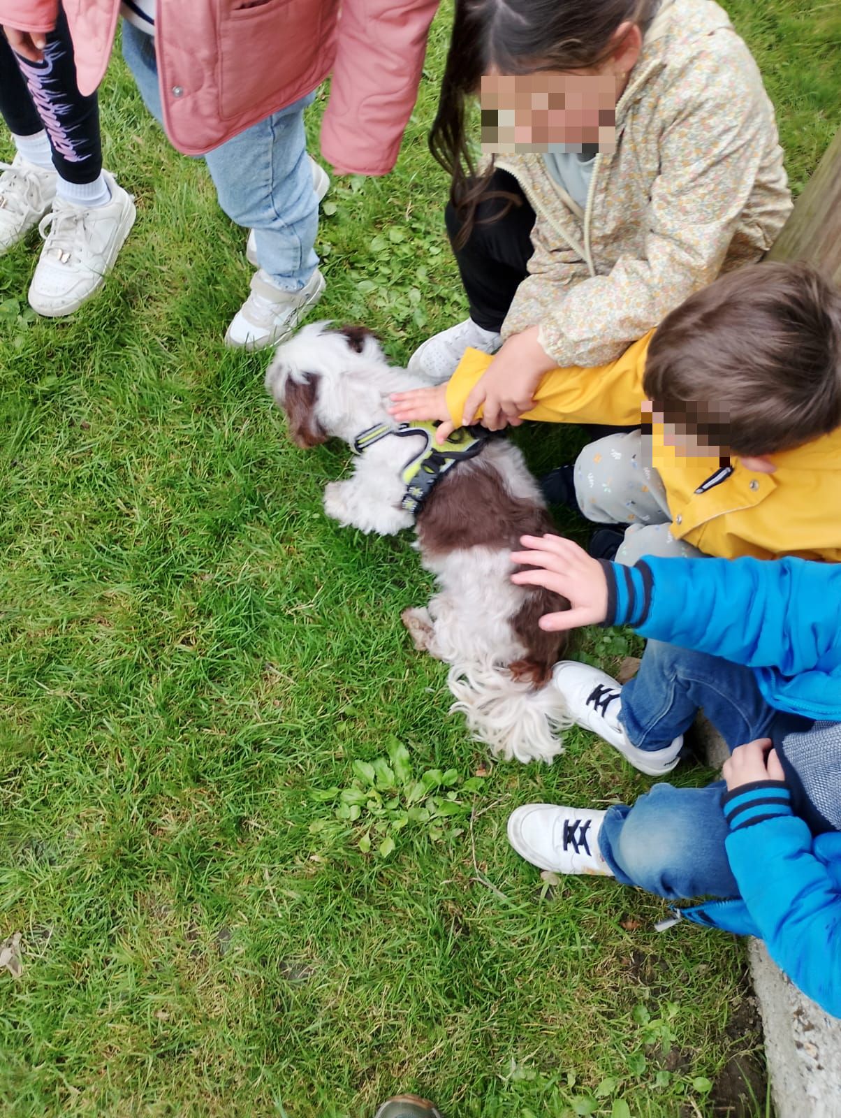 Lucille a pris soin d’accueillir les enfants en petits groupes, y compris ceux qui avaient peur des chiens. Avec douceur et bienveillance, elle les a mis en confiance : toucher le museau, les caresser, les brosser, jouer, chercher des friandises ou encore les promener en laisse dans le jardin de l’école.