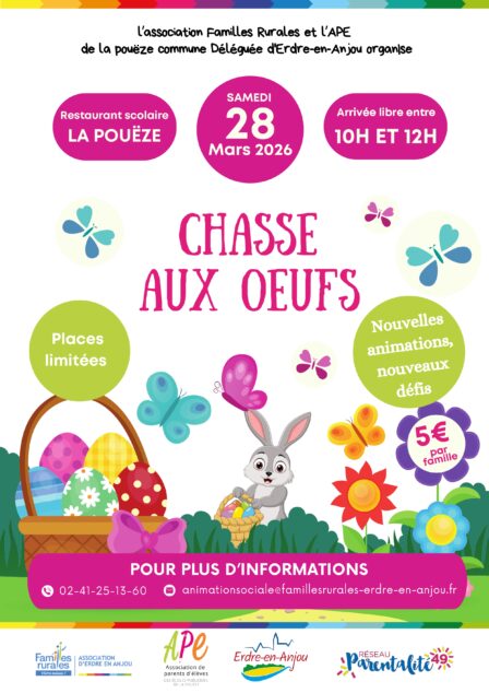 Familles Rurales d’Erdre-en-Anjou organise une chasse aux œufs le 2 avril, de 10h à 12h, à la Maison pour Tous à La Pouëze.